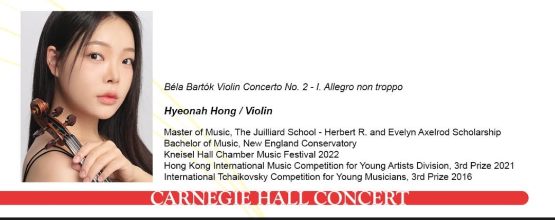 미국 뉴욕 줄리아드 음악원 대학원(MM)에 재학중인 바이올리니스트 홍현아가 2024년12월24일 뉴욕 카네기홀에서 연주회가 있습니다.